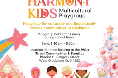 Harmony Kids (Multicultural Playgroup) 06 Feb 2026 Held weekly to celebrate diversity in the community and create a space for play, connection, and fun.Free to attend and everyone is welcome. Philip Street Community and Families Precinct, 1 Pengelly Street, Gladstone 4680 37 more dates Tagged as: , Babies & Toddlers, Children & Families, Culture, History and Heritage, Education and Learning