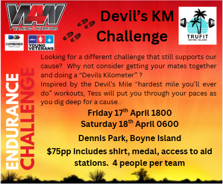 The 2026 Annual Walking4Warriors Endurance Challenge returns for its 6th year on 17–18 April 2026 at Dennis Park, Boyne Island, and this year promises to be our biggest and most meaningful event yet.